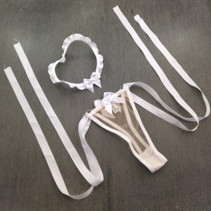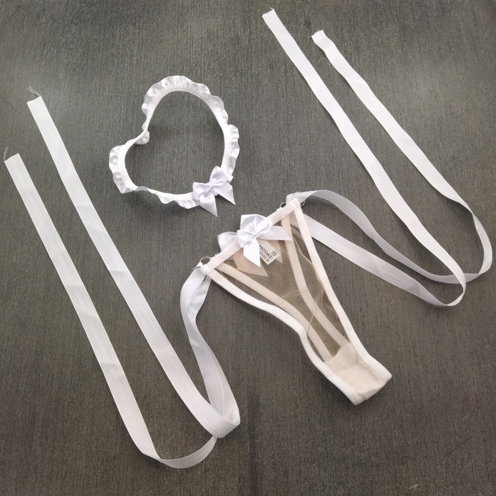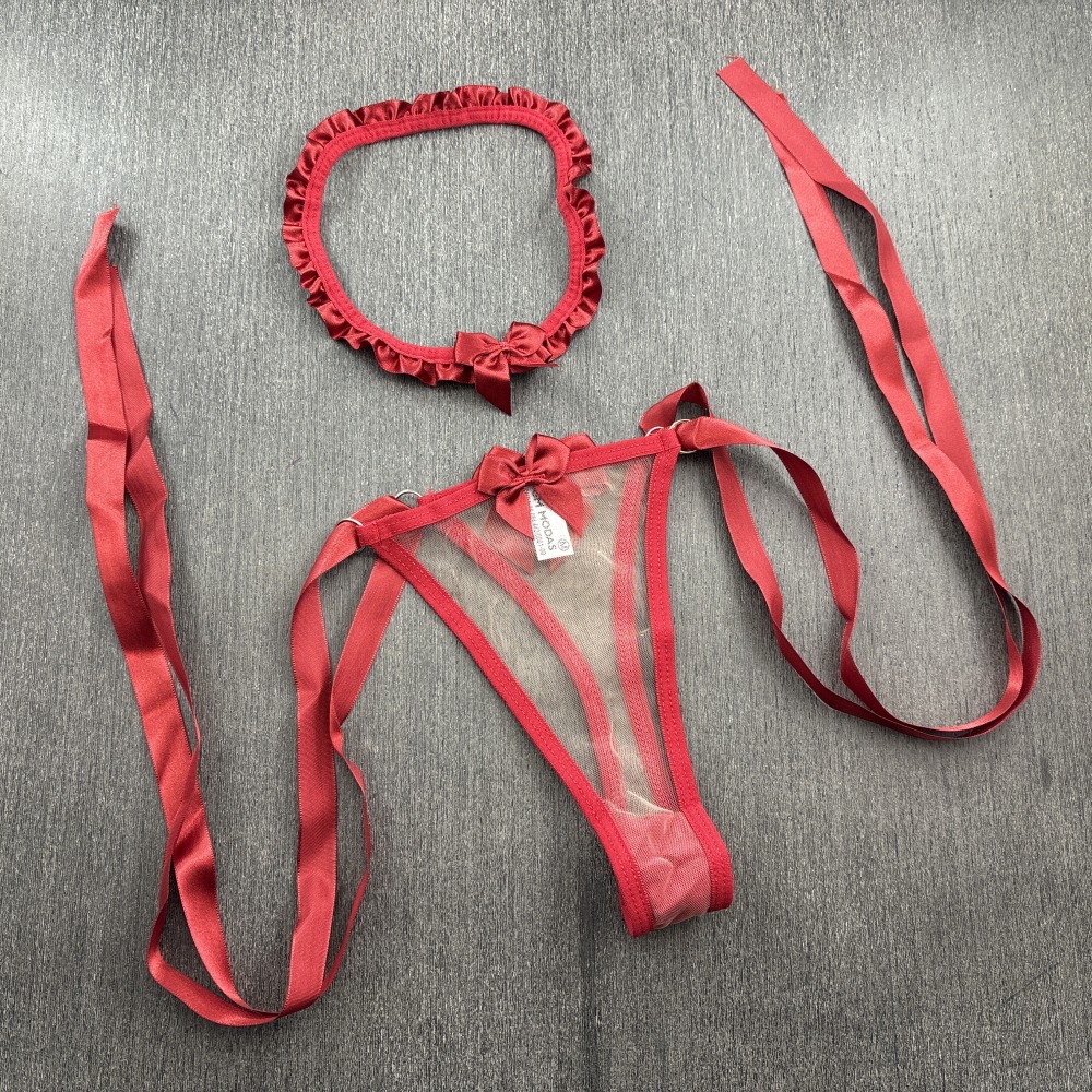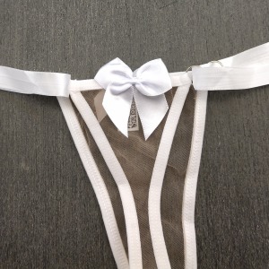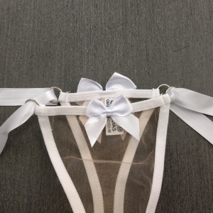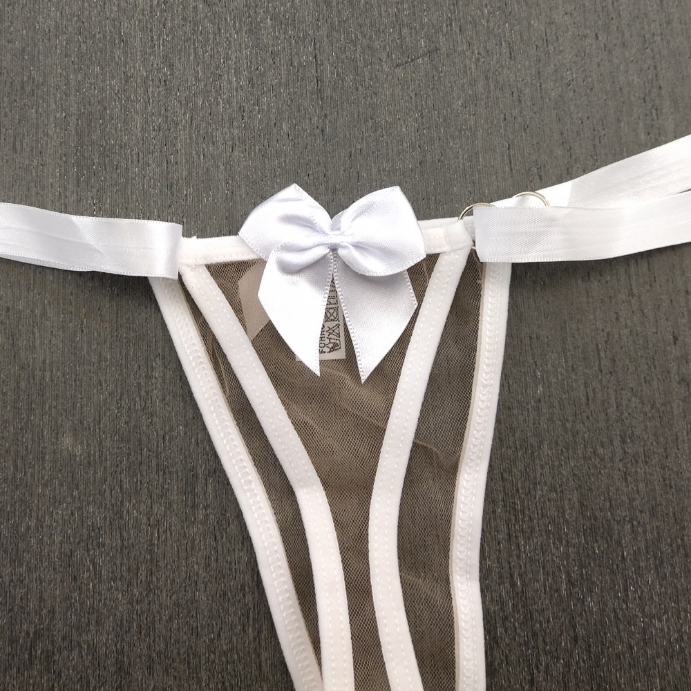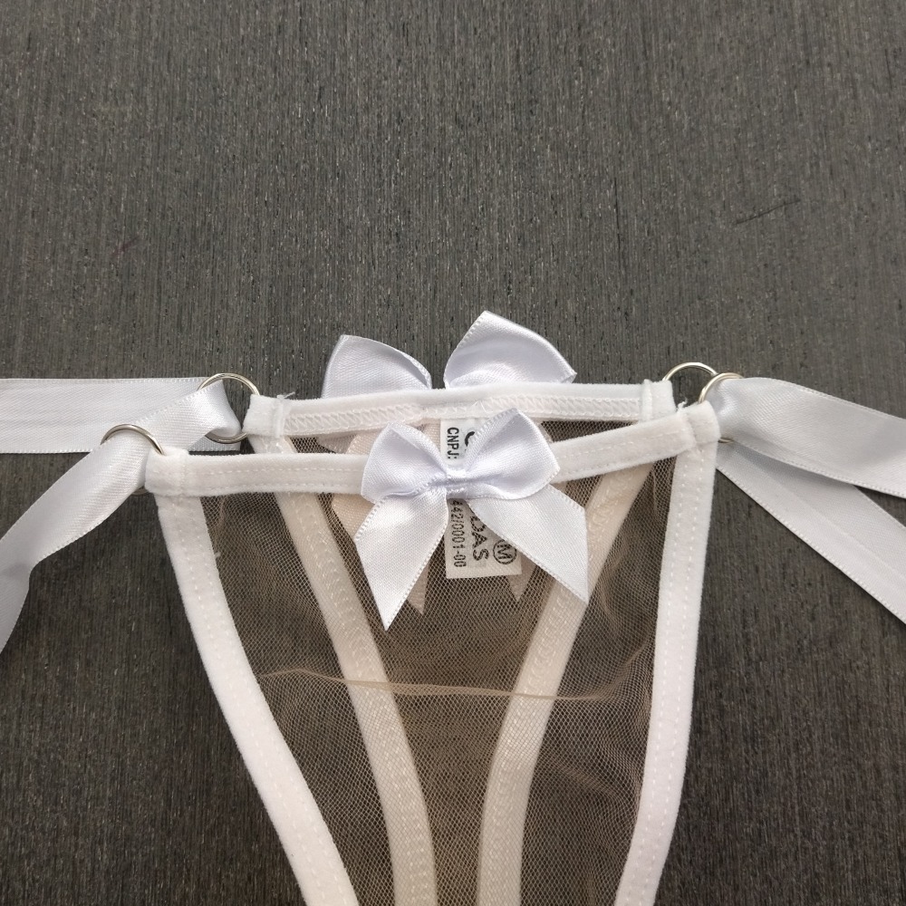 Essa tanga possui um design super delicado e sensual, com laços de cetim nas laterais e na parte traseira, proporcionando um toque romântico à peça. O modelo conta com tiras finas que se amarram nas laterais, permitindo um ajuste personalizado e confortável. A parte frontal é feita de tecido translúcido, criando um visual ousado, enquanto a parte traseira segue o estilo fio dental, valorizando as curvas. Além disso, a peça vem com uma cinta de perna decorativa com babados, adicionando um detalhe extra de charme e sofisticação ao look.