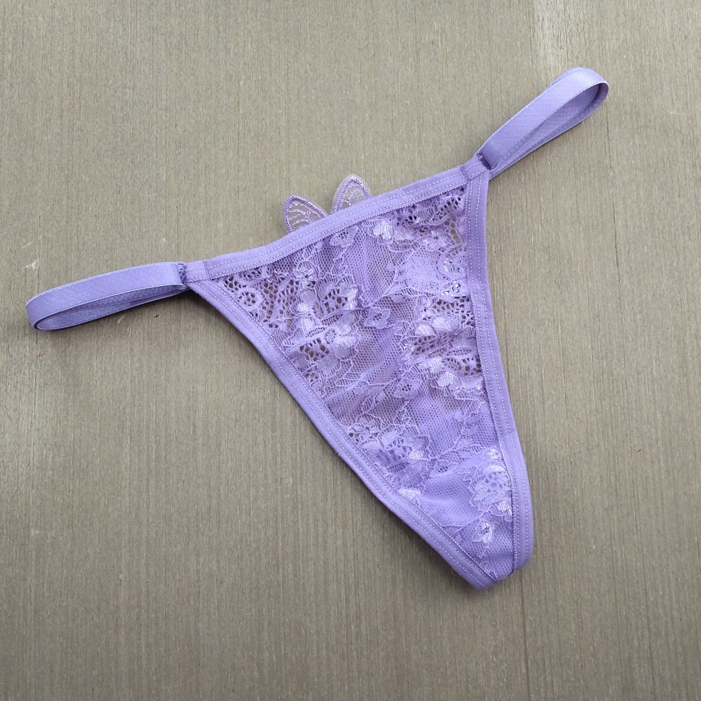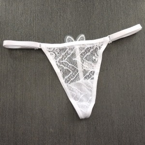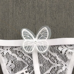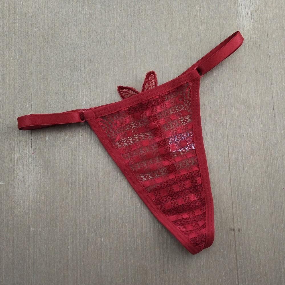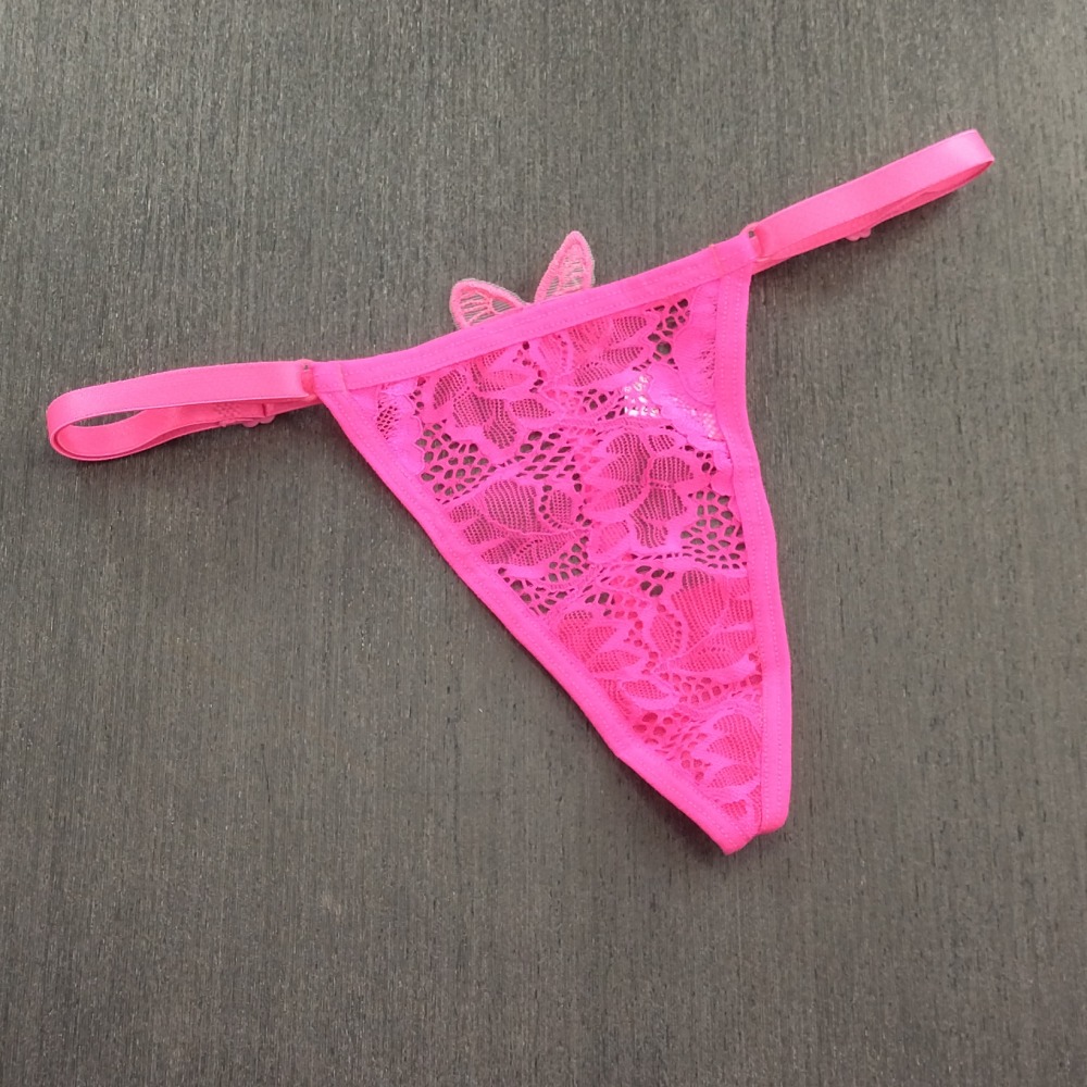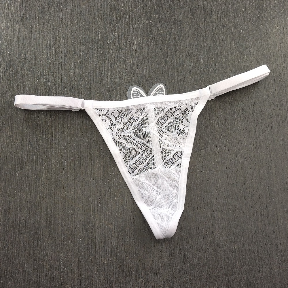 Tanga estilo fio dental, confeccionada com renda delicada e detalhes em transparência. Na parte frontal, a renda oferece um toque sensual e sofisticado. Na parte traseira, além da característica fina do fio, há um pequeno detalhe em forma de borboleta, que confere charme e elegância ao design. Os elásticos finos e ajustáveis nas laterais proporcionam conforto e valorizam o caimento no corpo.