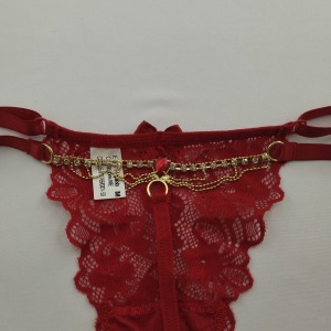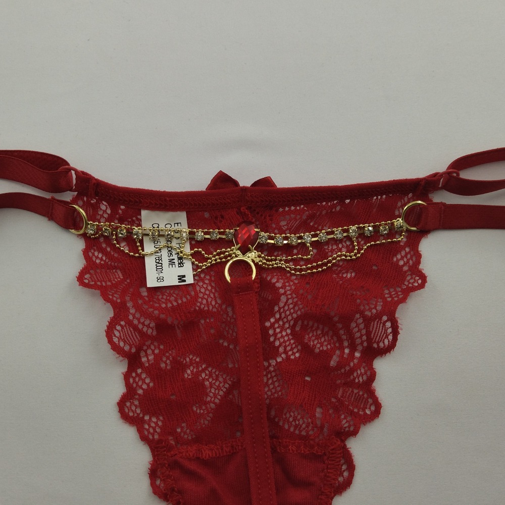 A Tanga Odalisca é a peça perfeita para quem busca sofisticação e sensualidade. Confeccionada em renda delicada, essa lingerie destaca a feminilidade com seu design charmoso e detalhes refinados. Na parte frontal, um laço sutil adiciona um toque romântico, enquanto a parte traseira surpreende com uma exuberante corrente de strass dourado e uma pedra central preta, criando um visual luxuoso e irresistível.