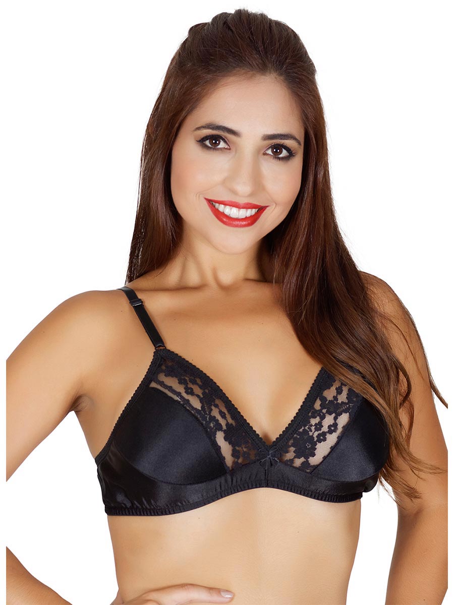 Modelo sem bojo, com modelagem anatômica para maior conforto, possui alças fixas e ajustáveis, fechamento traseiro através de colchetes,possui aplicação de delicado lacinho de cetim no entremeio frontal e rendinha na parte superior.