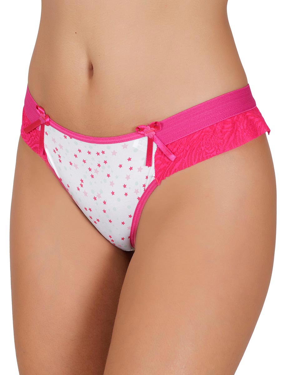Tanga confeccionada em microfibra estampada e detalhes em renda nas laterais.
