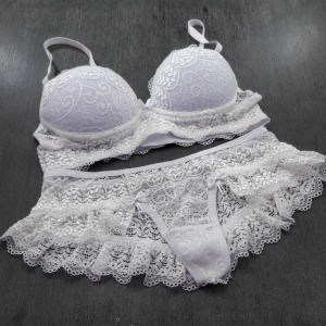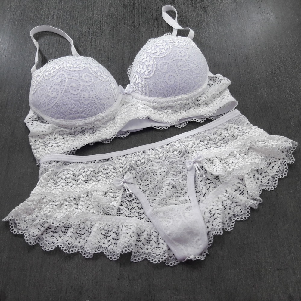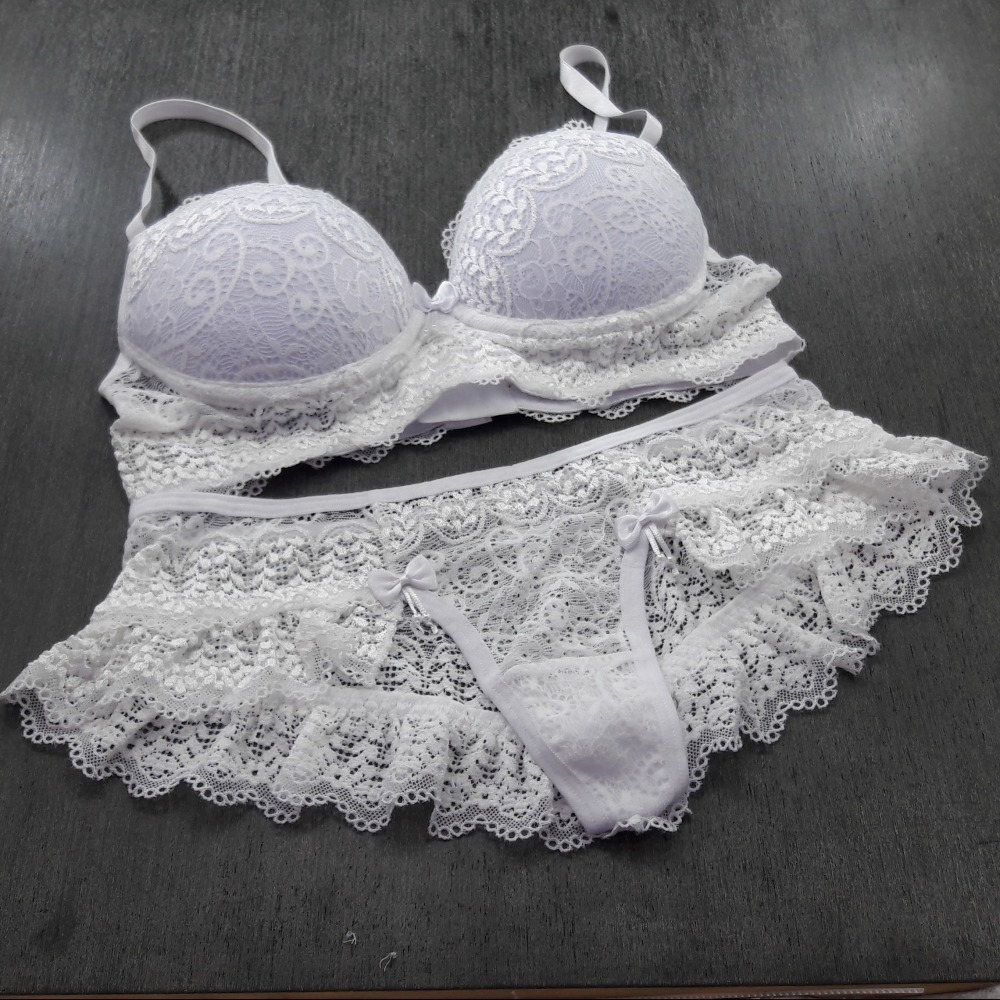 O Conjunto Thais possui uma modelagem moderna, sofisticada e sensual! Produto ideal para noites especiais. O item é composto em renda e possui forro em algodão. Seu sutiã possui alças reguláveis e aro para maior sustentação e conforto, além de laço em cetim. A calcinha possui babados em renda na parte superior e laços em cetim.