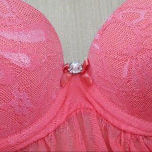 Decote que confere a peça muita elegância, renda sobreposta no bojo e delicado broche em pedraria no entremeio frontal.