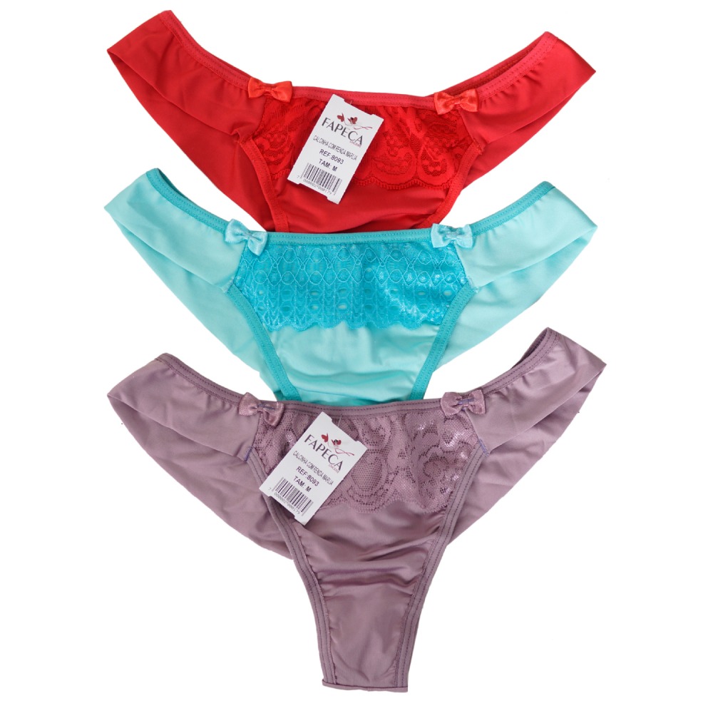 Calcinha confeccionada em microfibra de poliamida, tecido altamente macio, leve , resistente e confortável para diversas ocasiões. Modelo apresenta modelagem convencional, com acabamento delicado, contendo revestimento em renda na sua parte superior e dois laços em cetim.
