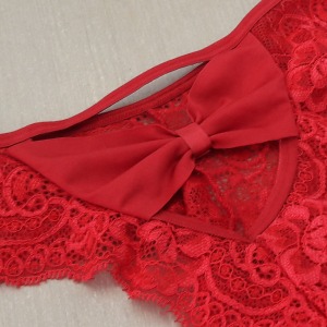 Calcinha produzida em renda, apresentando uma modelagem super sensual e delicada. Possui o forro interno revestido em algodão. O detalhe fica por conta da abertura em formato de laço.
