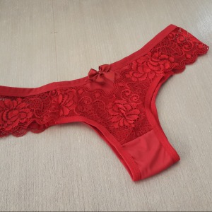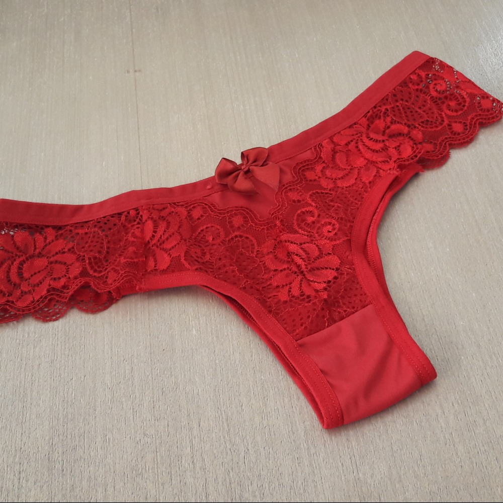 A calcinha na parte frontal é em renda e na posterior lisa. Além disso, possui lindo detalhe de laço em cetim com um delicado pingente em formato de coração na sua parte central frontal.