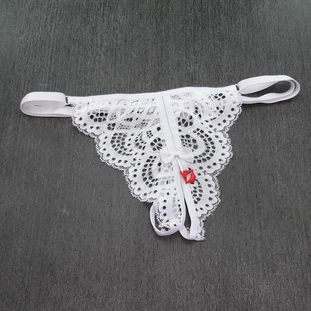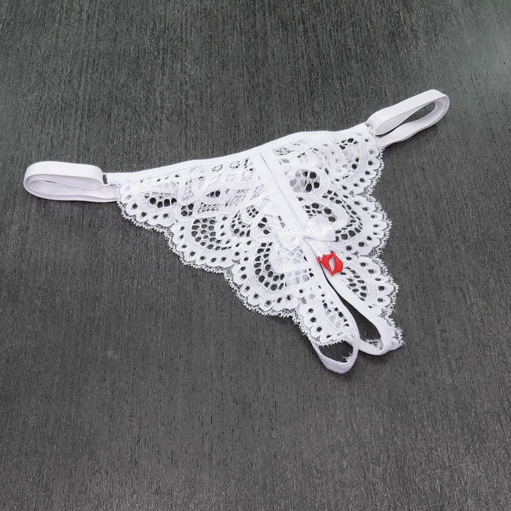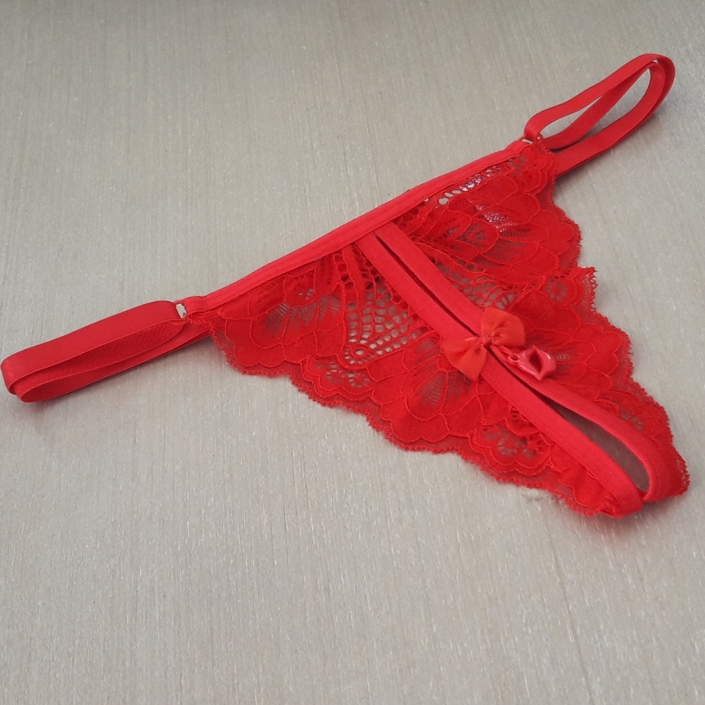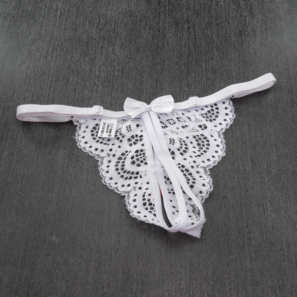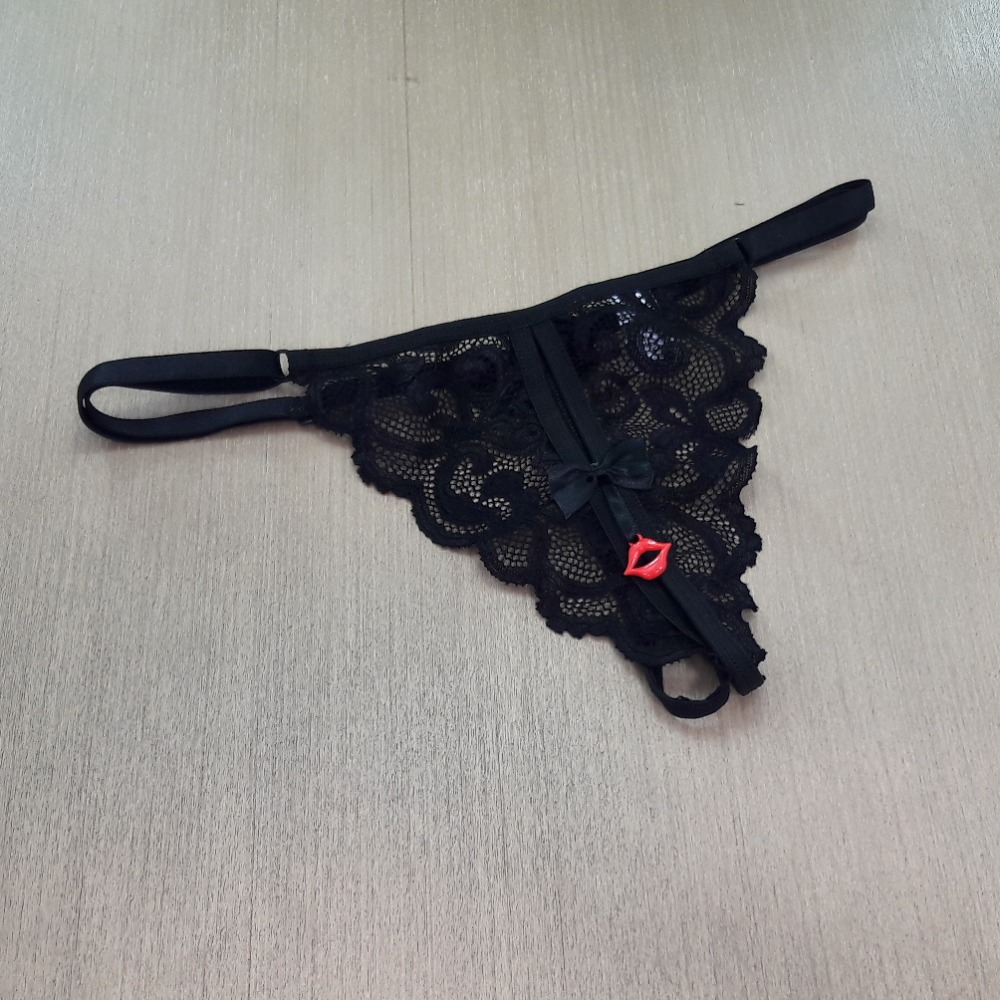 Tanga modelo fio dental revestida de renda. Produto super sensual, sofisticado e charmoso, peça altamente indicada para os momentos especiais. Sua modelagem apresenta pingente em boca, além disso, contém lindo laço cem cetim na parte posterior da peça. Possui laterais reguláveis.