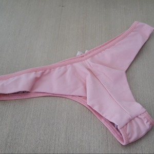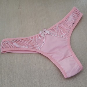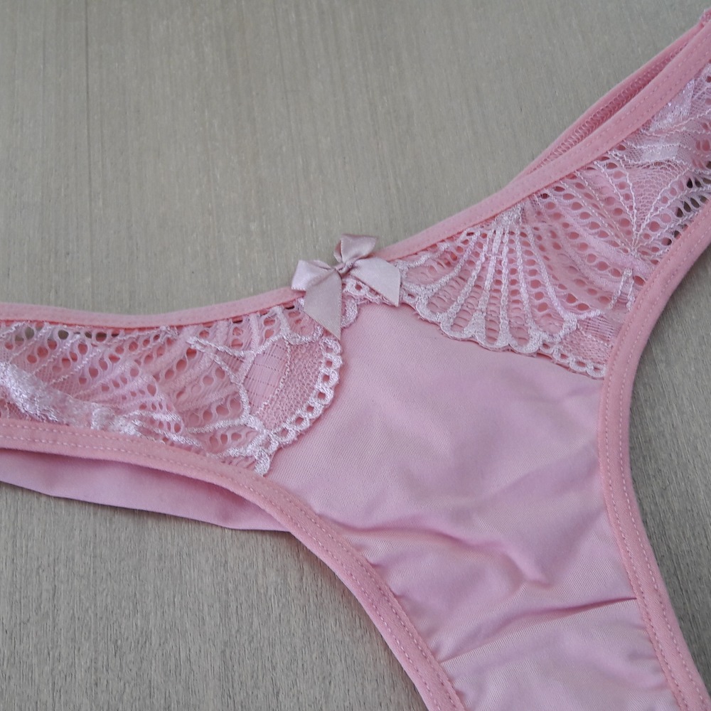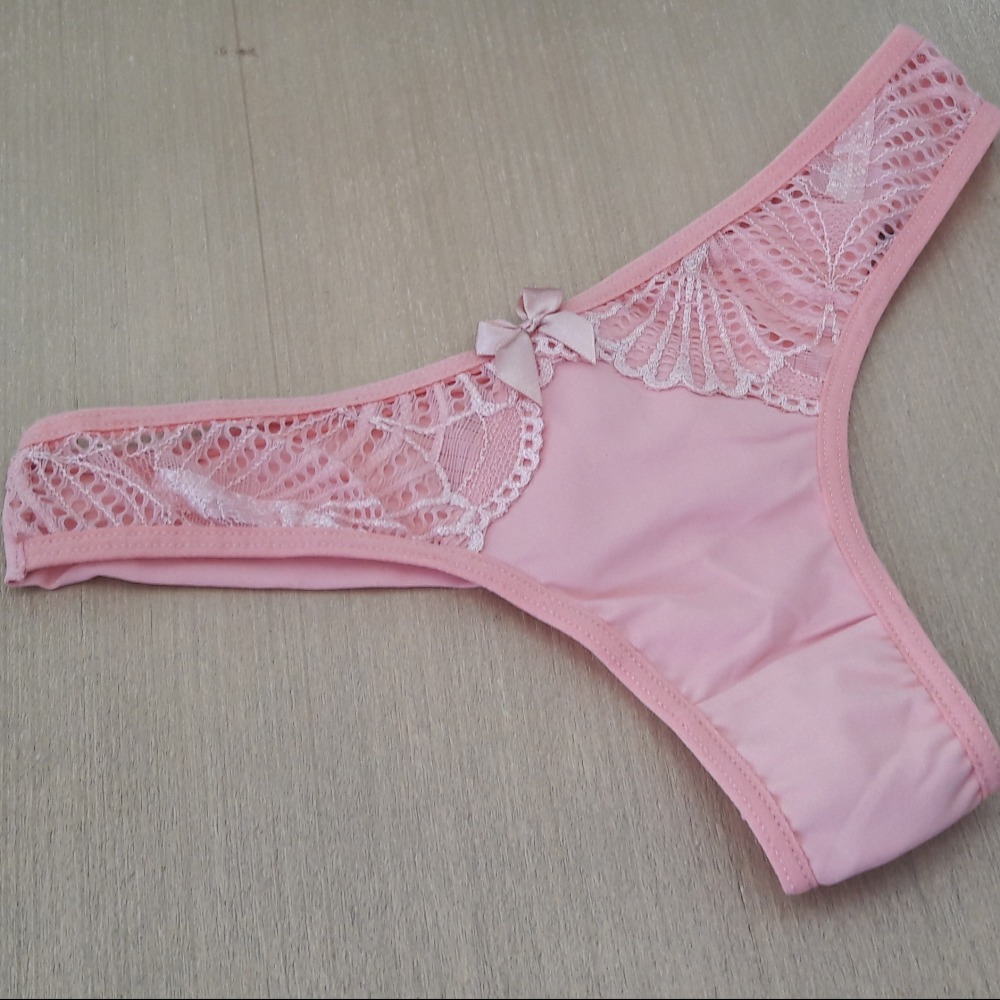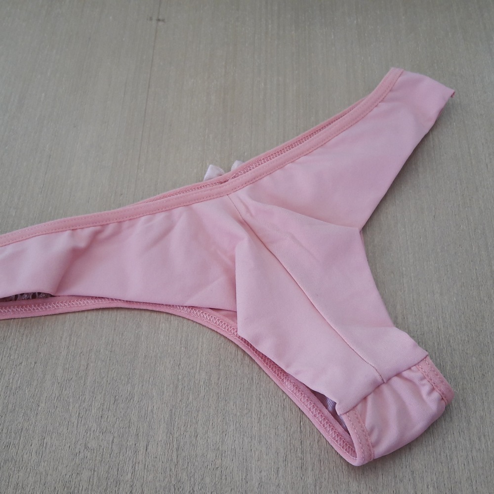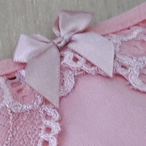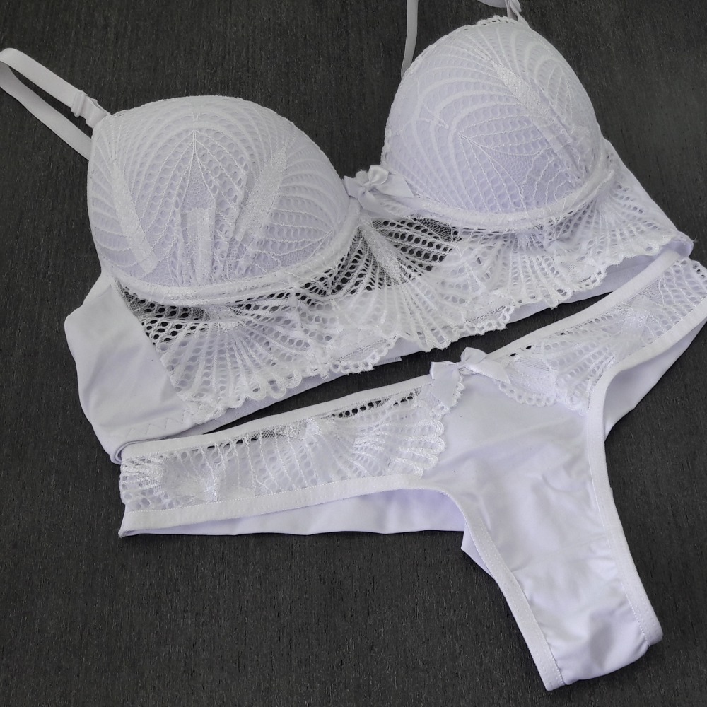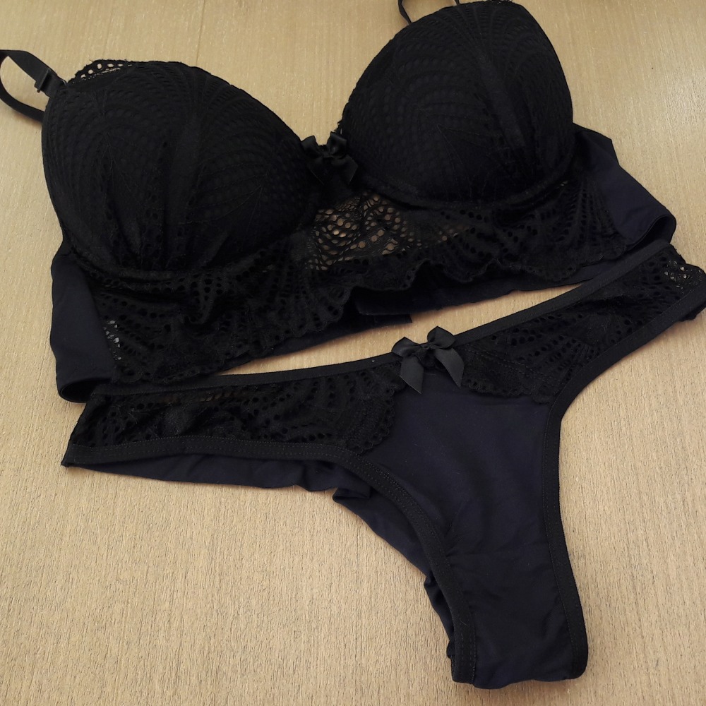 Calcinha modelo fio duplo com detalhe em renda e lacinho na parte da frente. Sutiã estilo cropped com bojo revestido em renda, fechamento traseiro por colchetes e alças ajustáveis.
