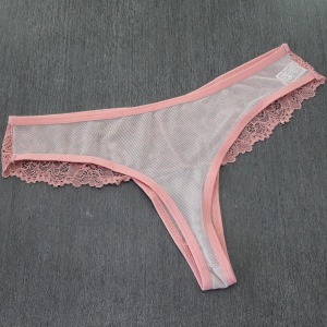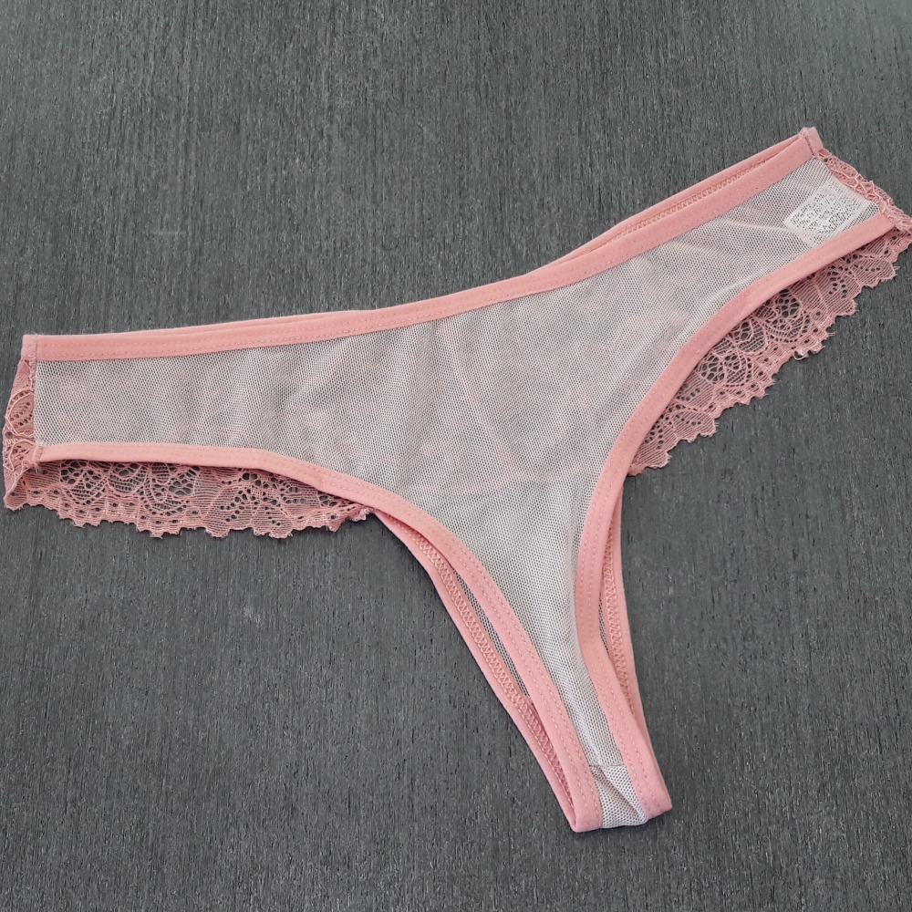Sutiã sem bojo, possui fechamento traseiro por colchete duplo, regulagem de metal. Tanga modelo fio, confeccionada em tule, detalhe em renda na frente e forro 100% algodão.