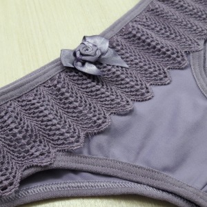 Calcinha modelo tradicional com sobreposição de renda e lacinho de cetim no entremeio frontal.