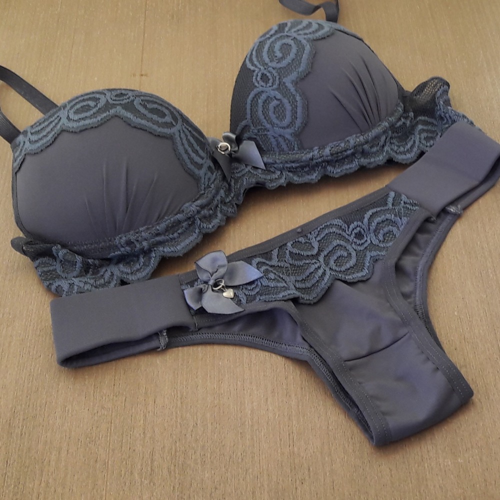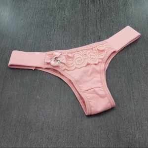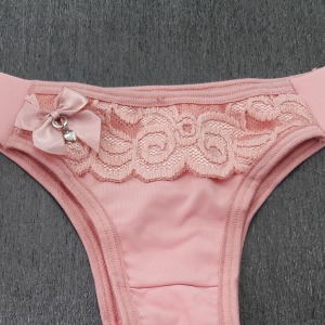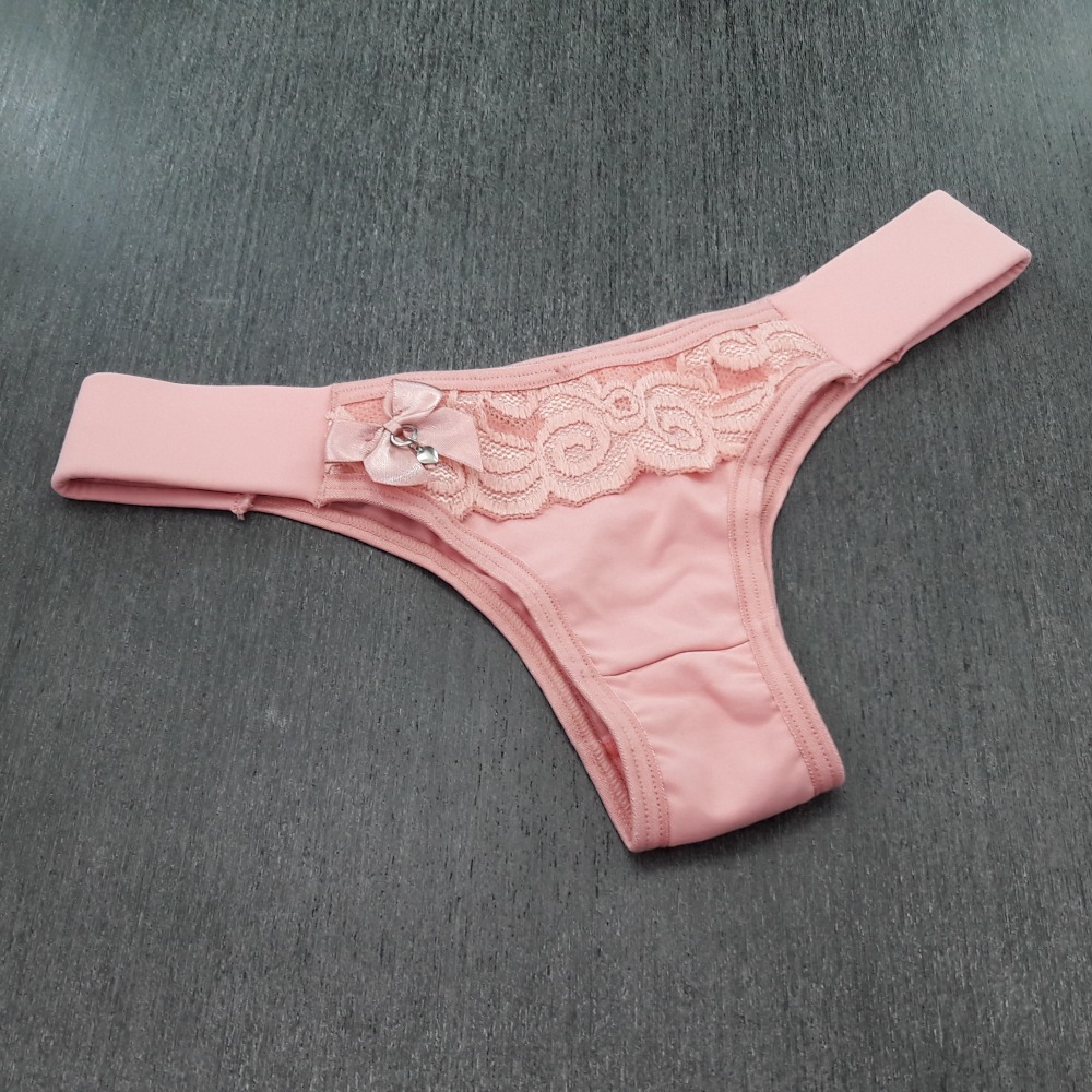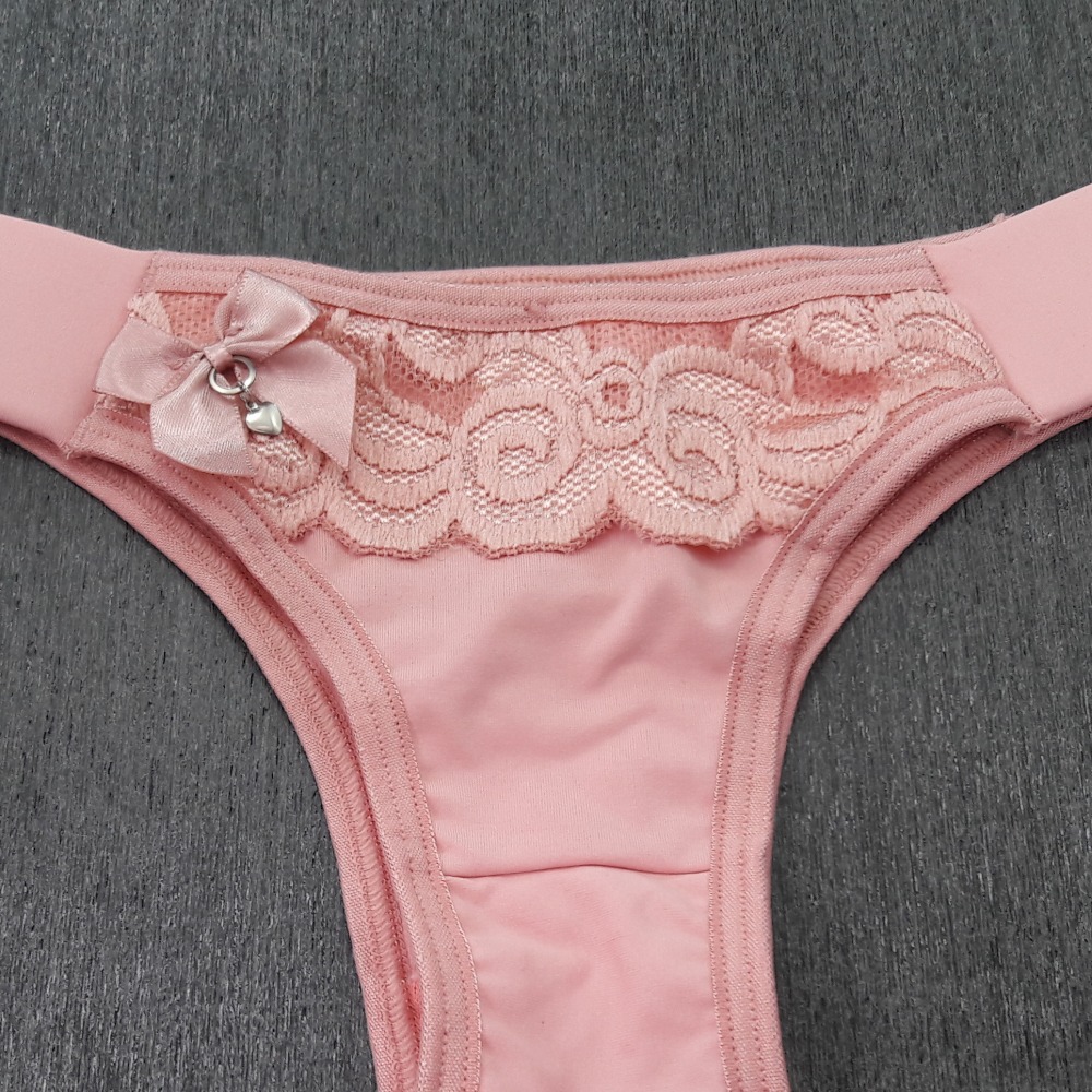 Calcinha com modelagem atual, renda sobreposta, laço de cetim e pingente na parte da frente.
