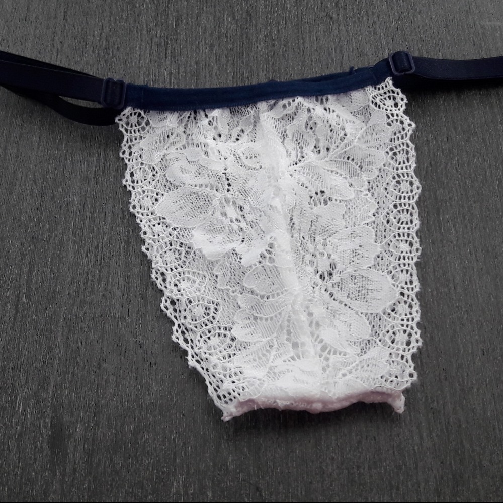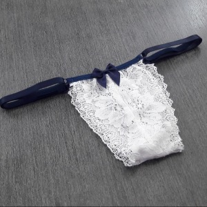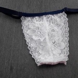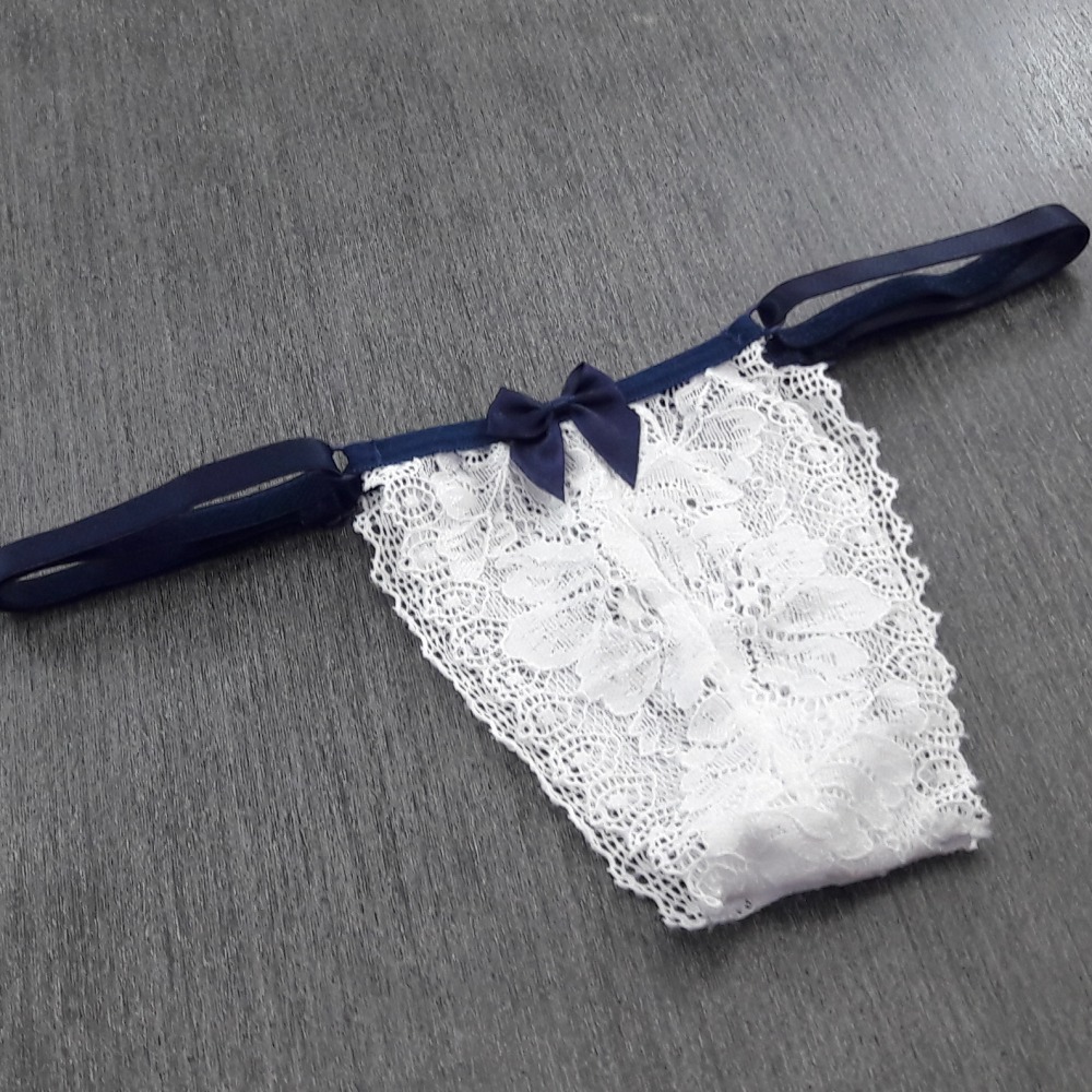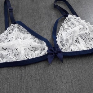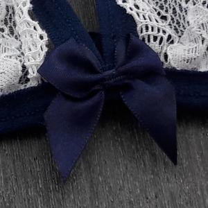 Conjunto Strappy confeccionado em renda com alças e viés em cores diferentes. Sutiã modelo strappy sem bojo, com alças ajustáveis e amarração nas costas. Tanga rendada, com forro de algodão e regulagens nas laterais para melhor ajuste ao corpo. Detalhes em lacinhos de cetim na tanga e no sutiã. Modelo cheio de charme e delicadeza!