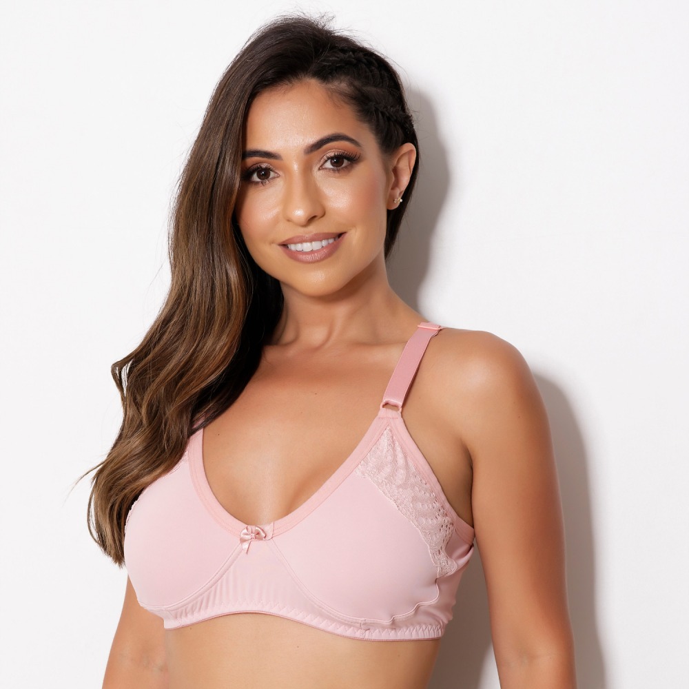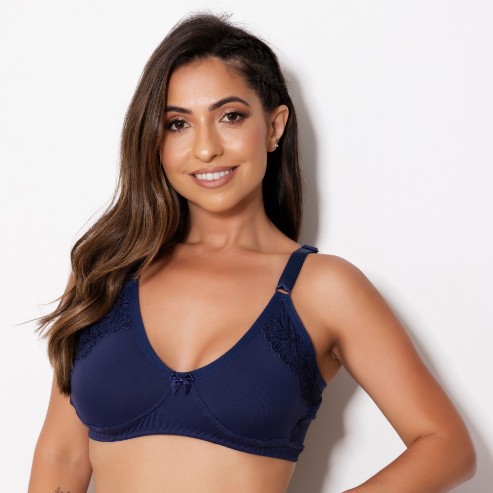 Modelo possui alças largas e reforçadas com regulagem, detalhes em renda na parte superior dos seios, fecho traseiro em colchetes duplo e regulável em três níveis e finalizada com um lacinho em cetim!