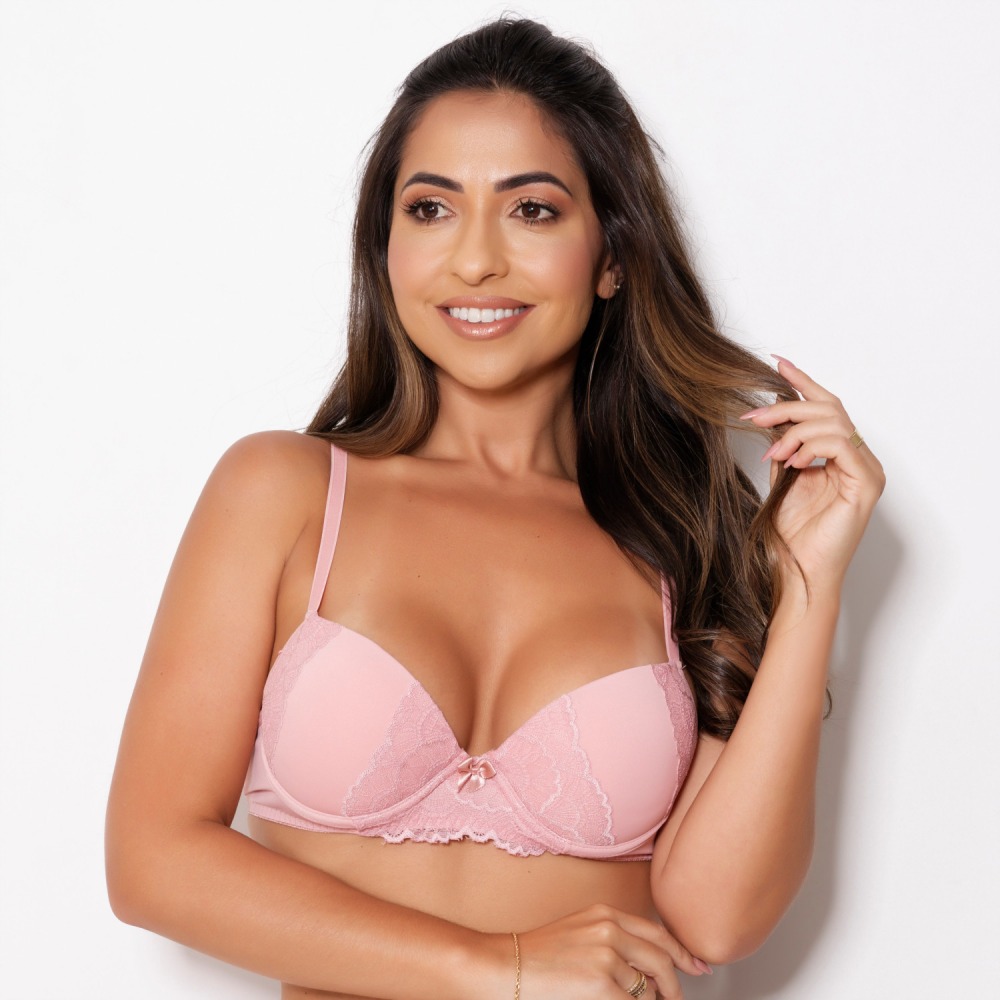 Detalhes em renda nas extremidades do bojo trazendo um diferencial a peça, alças de 10 milímetros de largura com regulagem de altura, fecho traseiro em colchetes duplo e regulável em três níveis e para finalizar a peça um laço de cetim na parte da frente!
