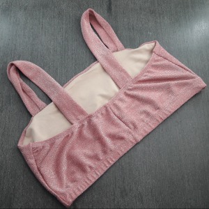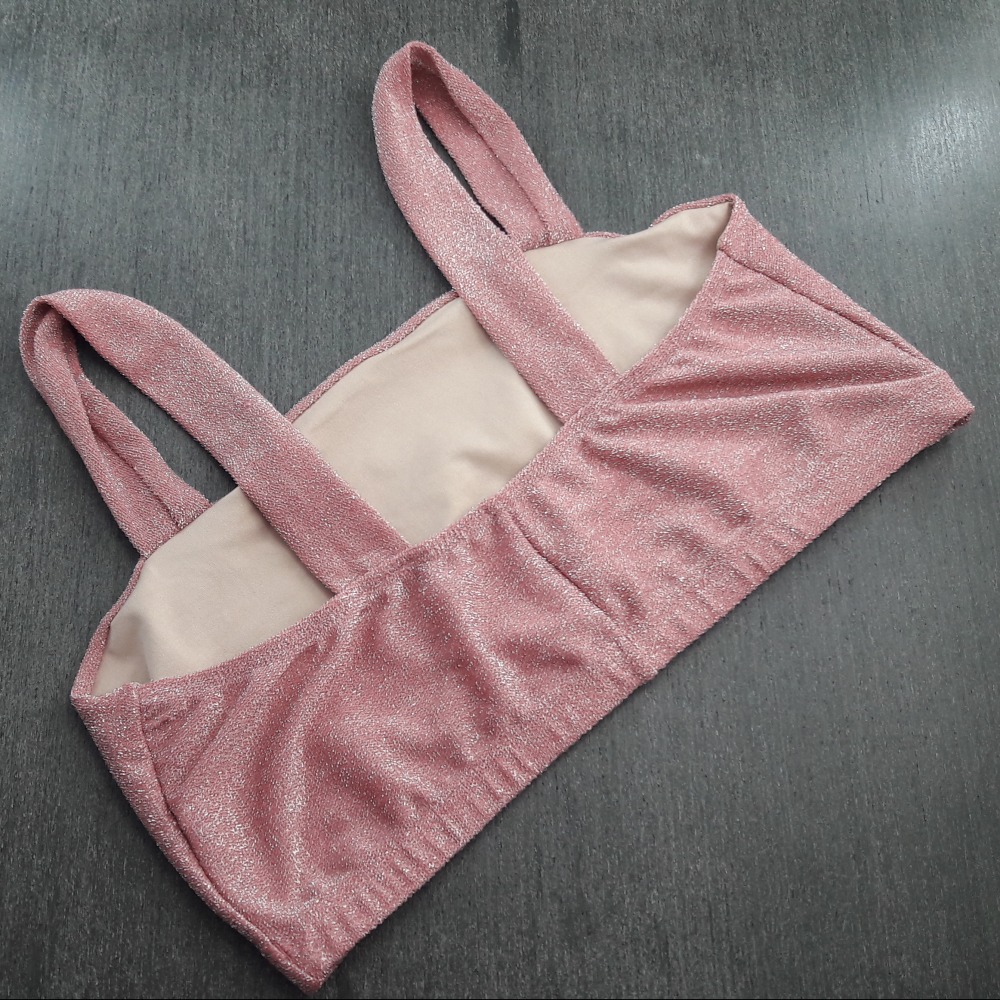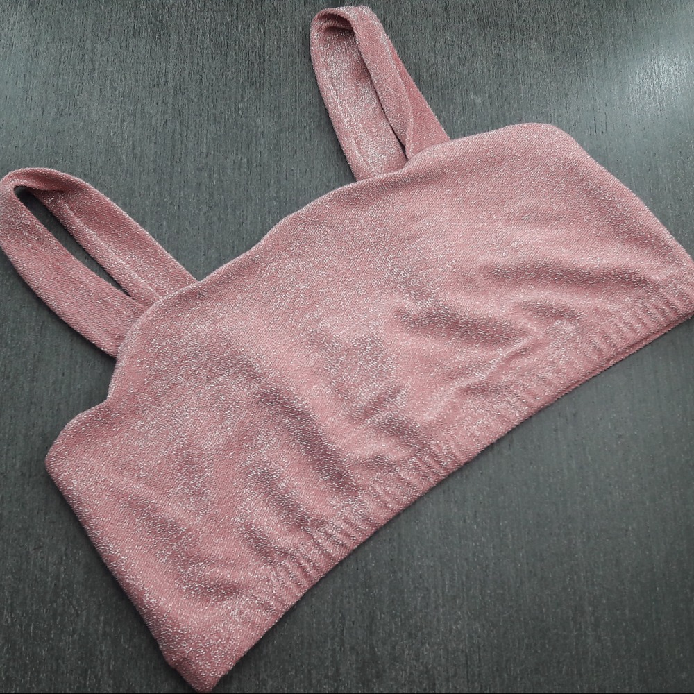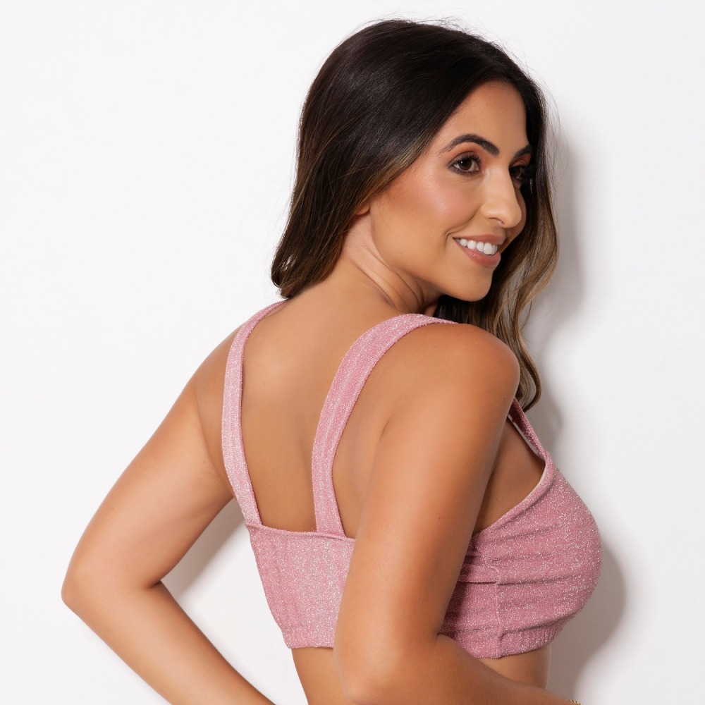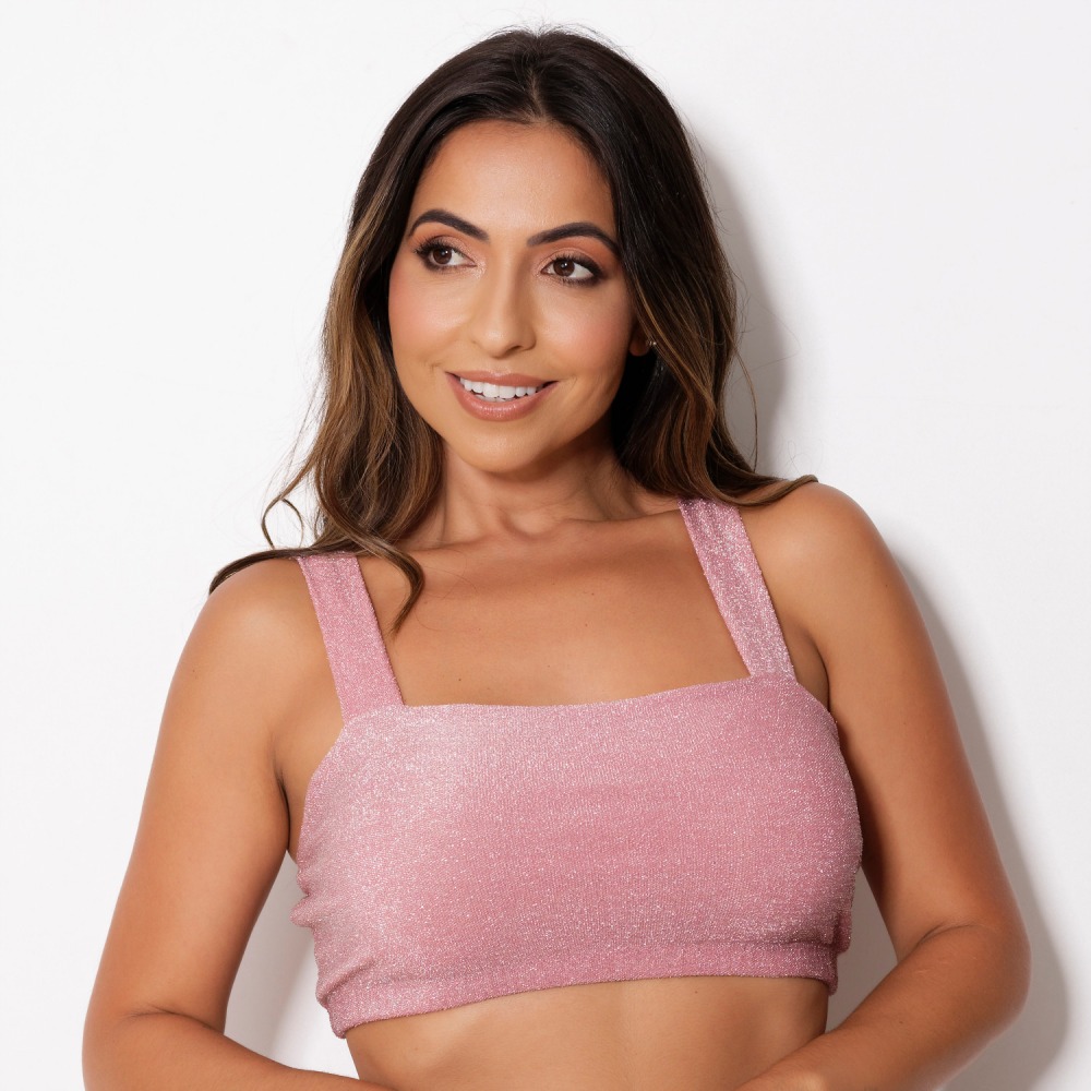 Top confeccionado em micro lurex, possui forro frontal e alças de tiras largas, possui elástico embutido na pala para garantir a sustentação dos seios. Ideal para compor looks.