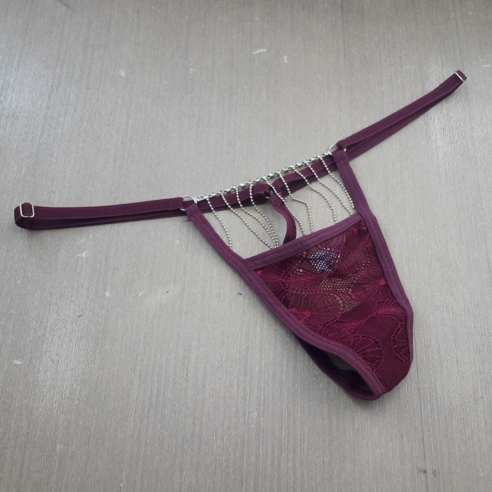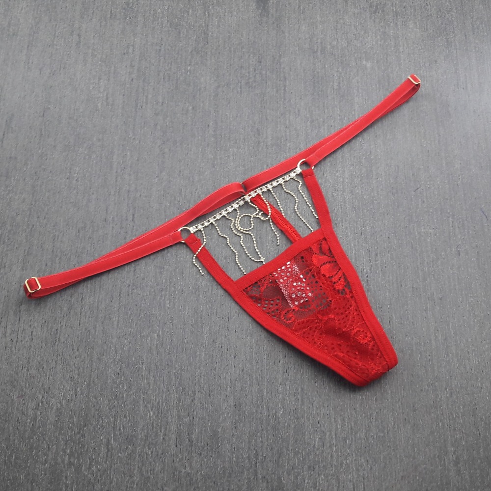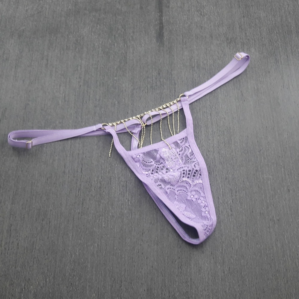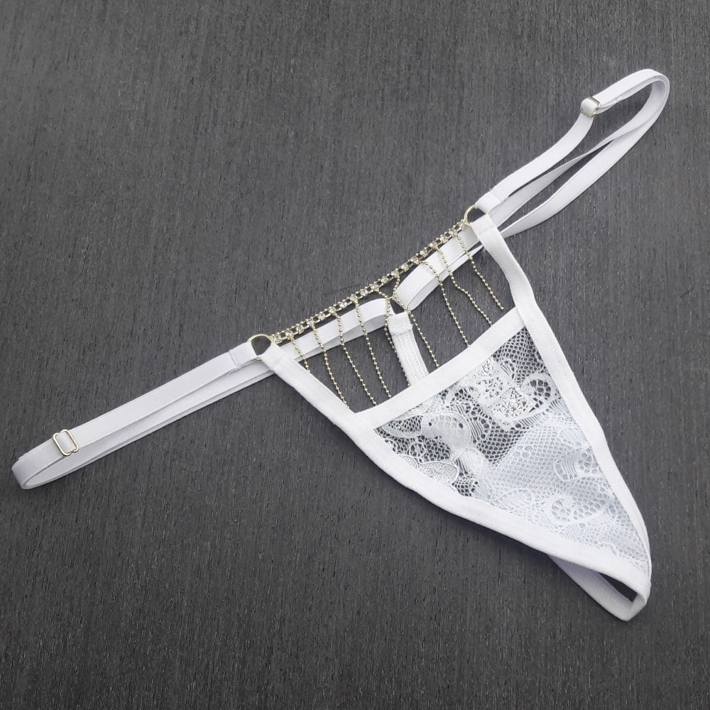 Tanga Odalisca é confeccionada em renda, viés de microfibra e alças com regulagem para ajustar a cintura. Uma calcinha fio dental sexy e luxuosa com bijuteria em Strass e regulagem em dourado.