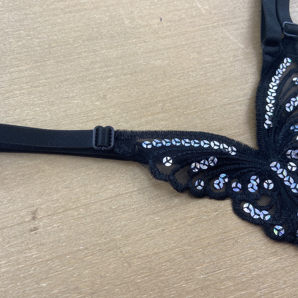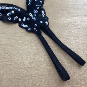 O modelo possui delicadas borboletas na frente e nas costas com acabamento em lantejoulas, além de regulagem na cintura para melhor ajuste ao corpo e abertura entre as pernas com viés.