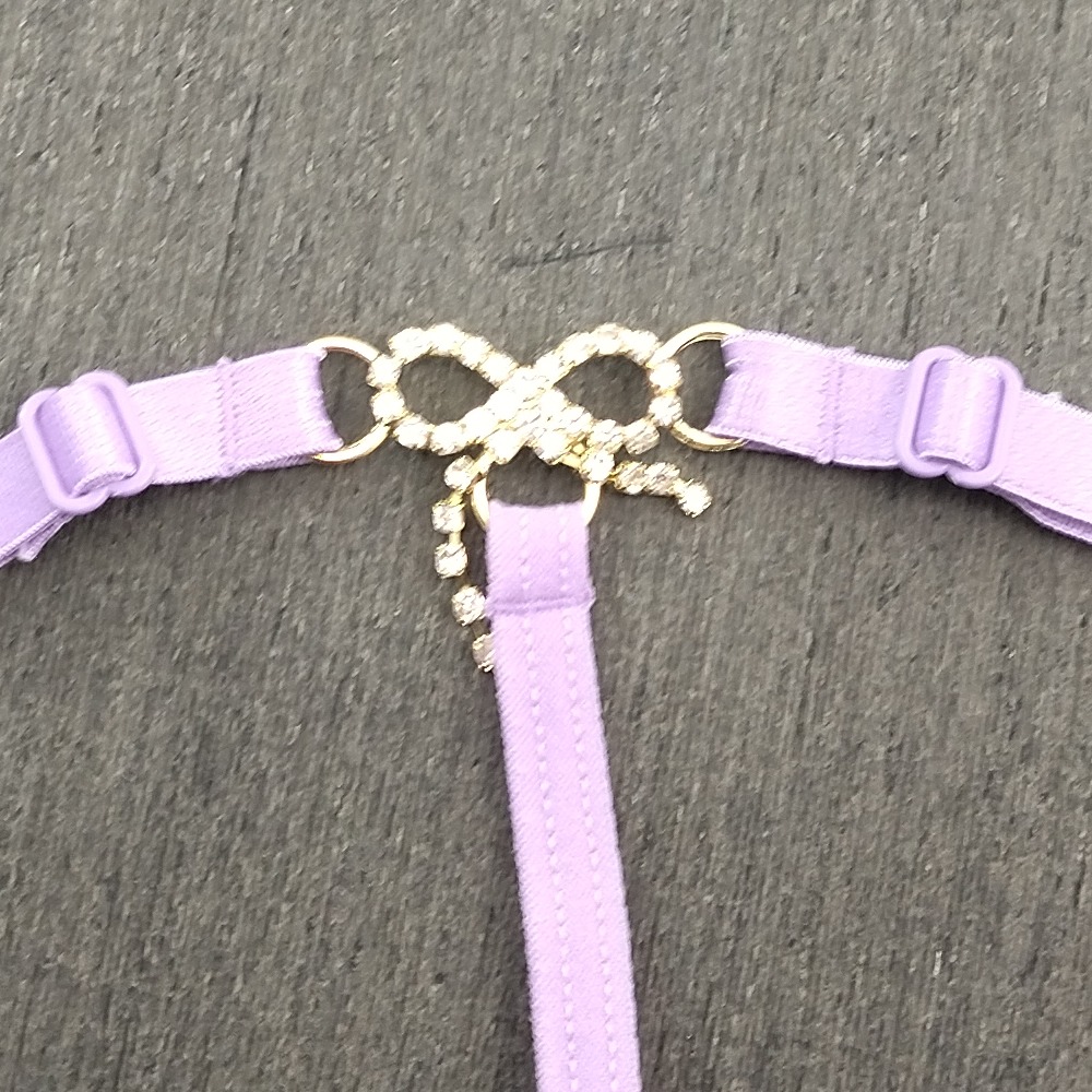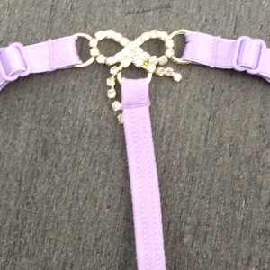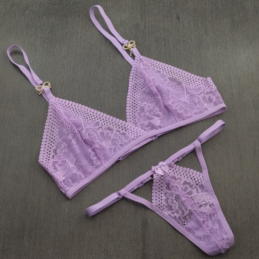 O conjunto "Laço Biju" é uma peça de lingerie sofisticada, composta por um sutiã e uma calcinha em renda. O sutiã apresenta taças triangulares que valorizam o busto, com alças finas e ajustáveis para maior conforto. Em ambas as alças, há um elegante detalhe em bijuteria dourada em formato de laço, que adiciona um toque de sofisticação. A calcinha é no estilo tanga, com recortes ousados que deixam a pele à mostra, destacando sua sensualidade. Assim como o sutiã, a calcinha também possui o detalhe em bijuteria dourada, mantendo a harmonia do conjunto.