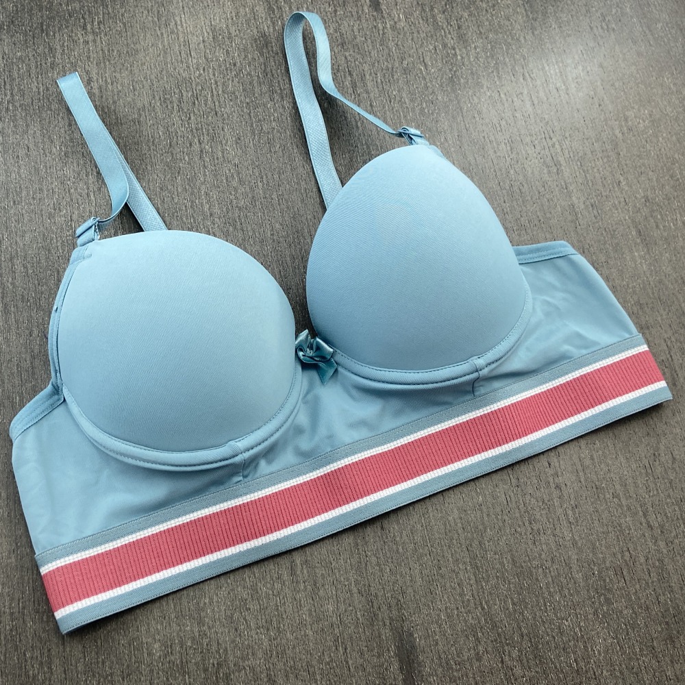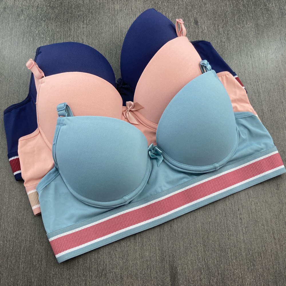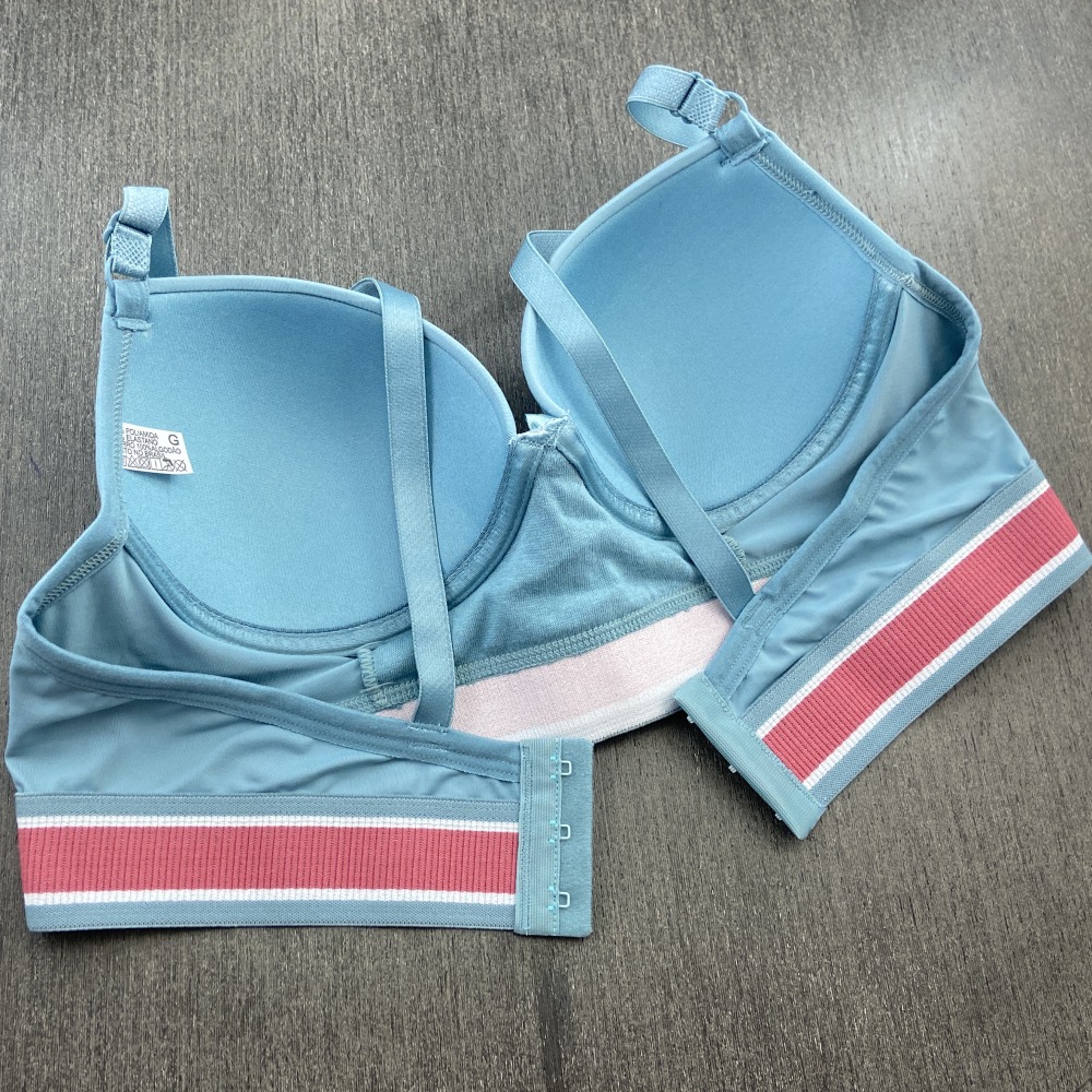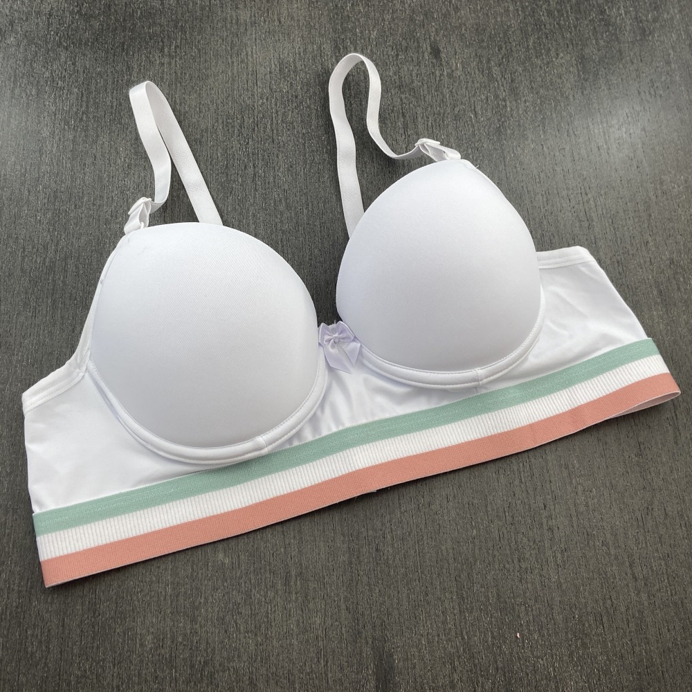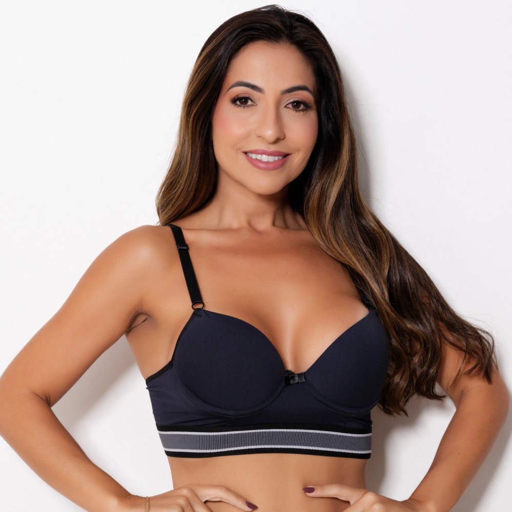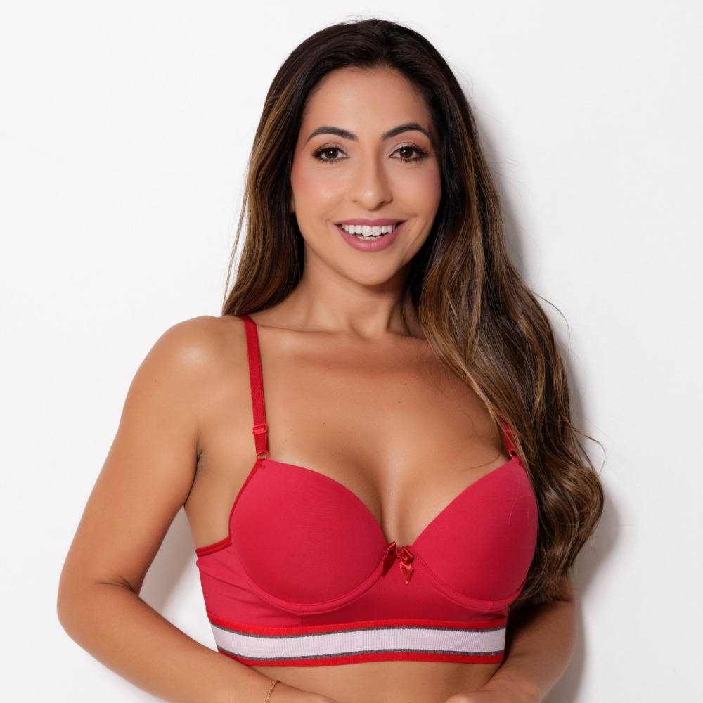 Sutiã confeccionado em tecido de poliamida lisa, possui bojo, lacinho no decote e elástico tricolor que combina com o tecido. Modelo moderno com elástico mais largo na pala que garante maior conforto, possui alças com ajustes de altura e fecho de colchetes nas costas.